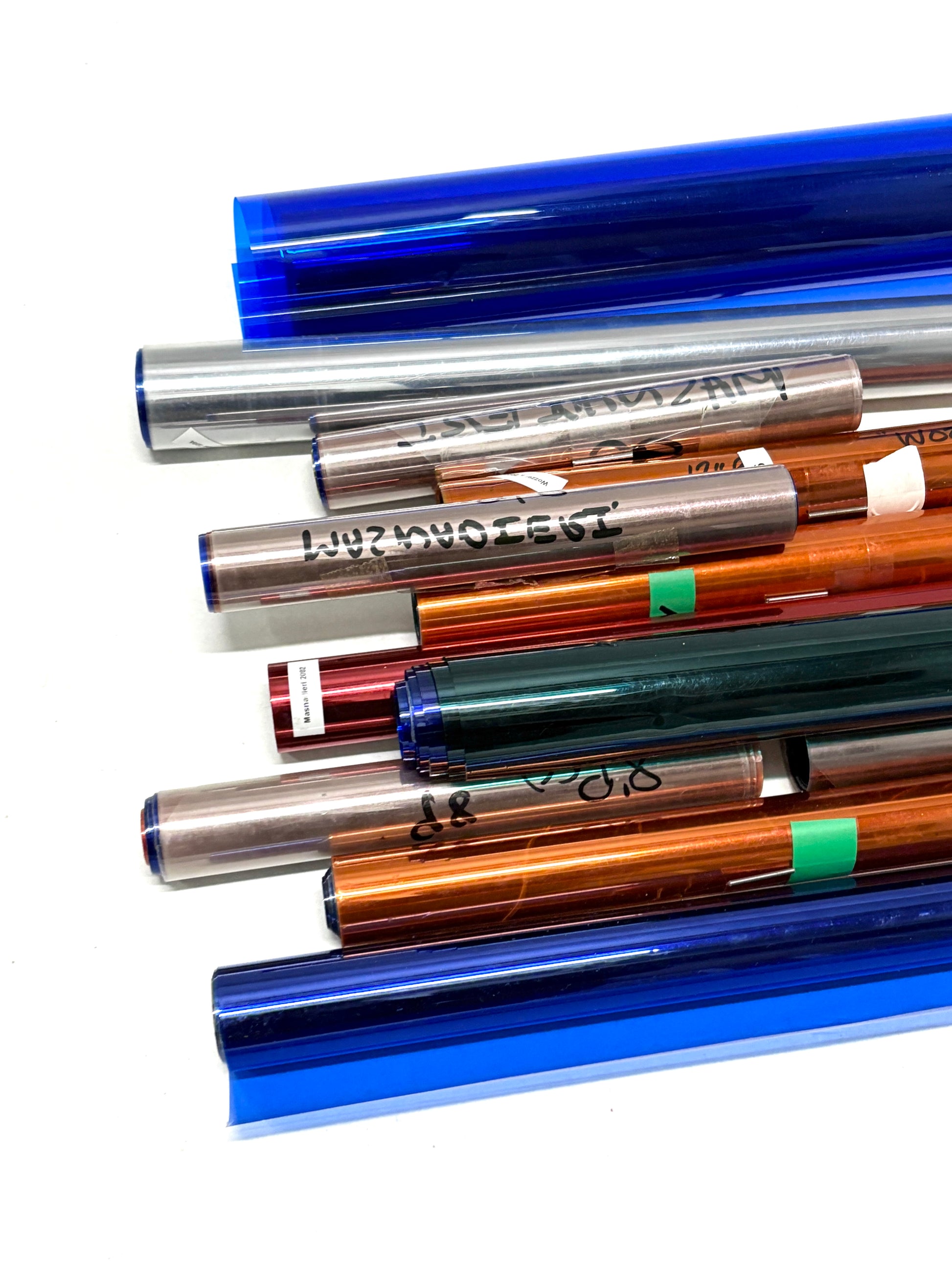 This is a mixed bundle of glossy paper and plastic rolls, supplied as individual rolls in assorted shiny materials. You will receive an assorted selection in different colours, textures, and transparencies, including cellophane, shiny wrapping paper, vinyl, and transparent tinted lighting gels previously used by The Royal Ballet & Opera, with rolls varying in width and showing signs of prior use. Suitable for backdrops and photoshoots, card making, gift wrapping, collage, art installations, and other creative or DIY uses.